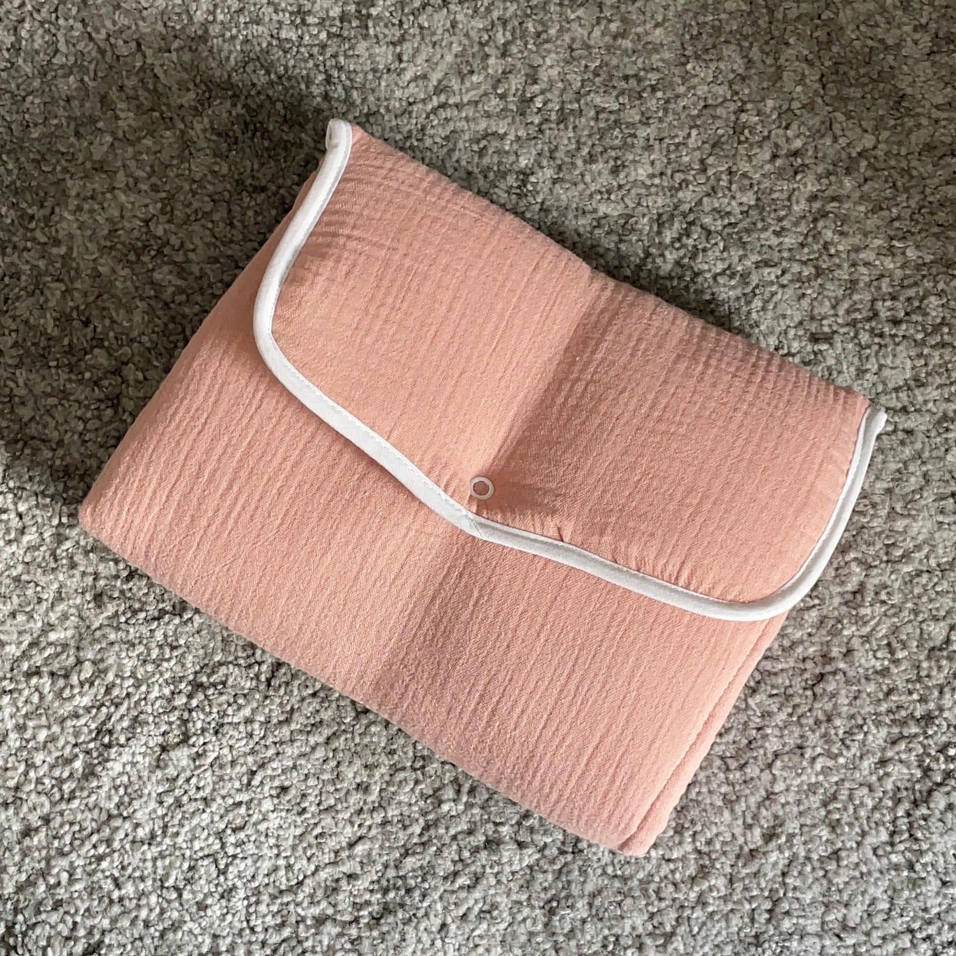 Ce tapis à langer allie praticité et confort avec sa gaze de coton douce à l'extérieur et une doublure intérieure imperméable. Facilement pliable, il se glisse dans n'importe quel sac pour accompagner tous vos déplacements, garantissant un espace de change propre et sécurisé en toutes circonstances. Idéal pour les parents mobiles soucieux de la qualité et de l'hygiène.